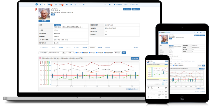病院の請求業務システムや電子カルテ、患者のバイタルや食事の量を記録するシステムなど、提供しているサービス内容は多岐にわたります。これらのシステムを導入することで、介護・医療現場の連携や省人化に貢献し、素早く正確な情報共有が可能になるというメリットがあります。