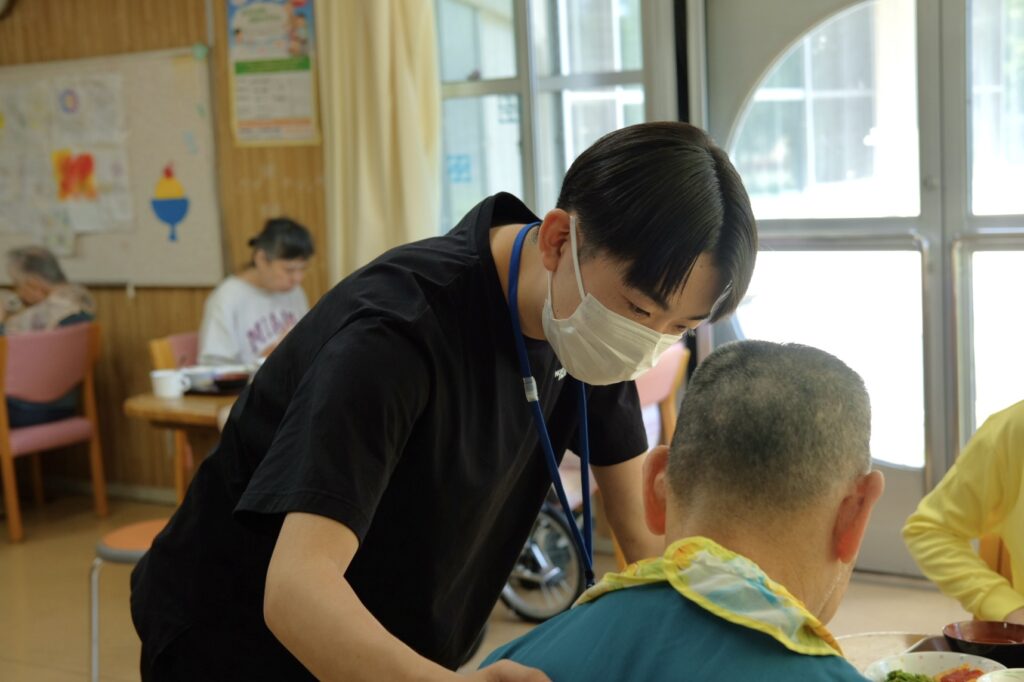 食事の見守りを行う田沼さん。アレルギーや誤嚥、栄養士と相談して決めた食事量を摂れているかなど、気をつけるポイントも一人ひとり違います
