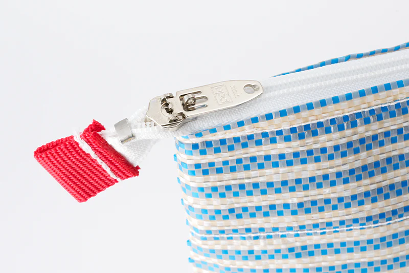 関東の人から「満員電車で口が開いたバッグは不安」という声をいただいて、ファスナー付きが生まれました。米袋用のゴツいファスナーの在庫が大量にあるので、そのまま使われています。織り機自体もデザイナーさんはかっこいいと言いますし、どれもあまりピンと来なかった我々は「それってファッション業界の人には良く見えるんだ…!」と勉強することばかりでした。